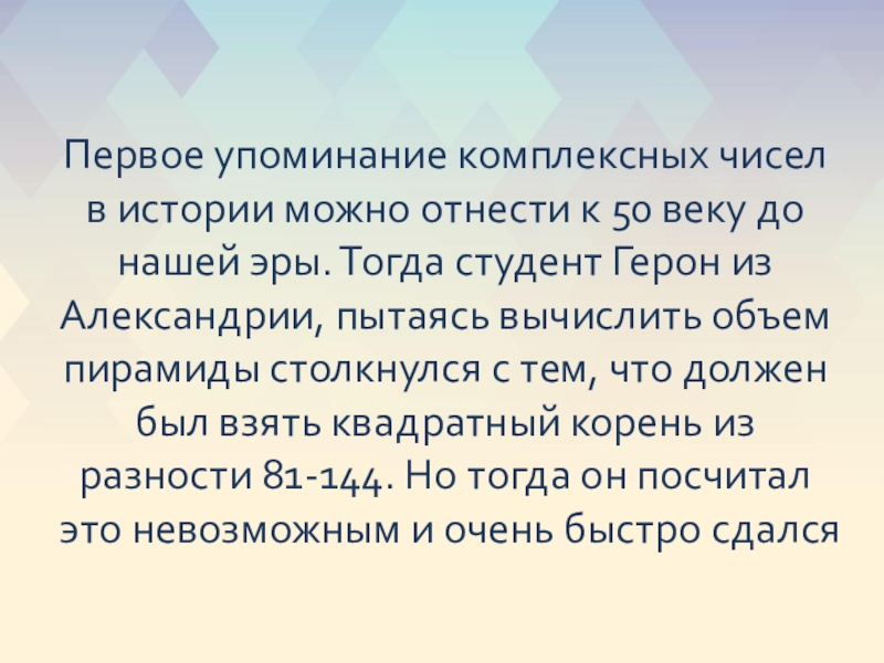 Первое упоминание комплексных чисел в истории можно отнести к 50 веку до нашей эры. Тогда студент Герон из Александрии, пытаясь вычислить объем пирамиды столкнулся с тем, что должен был взять квадратный корень из разности 81-144. Но