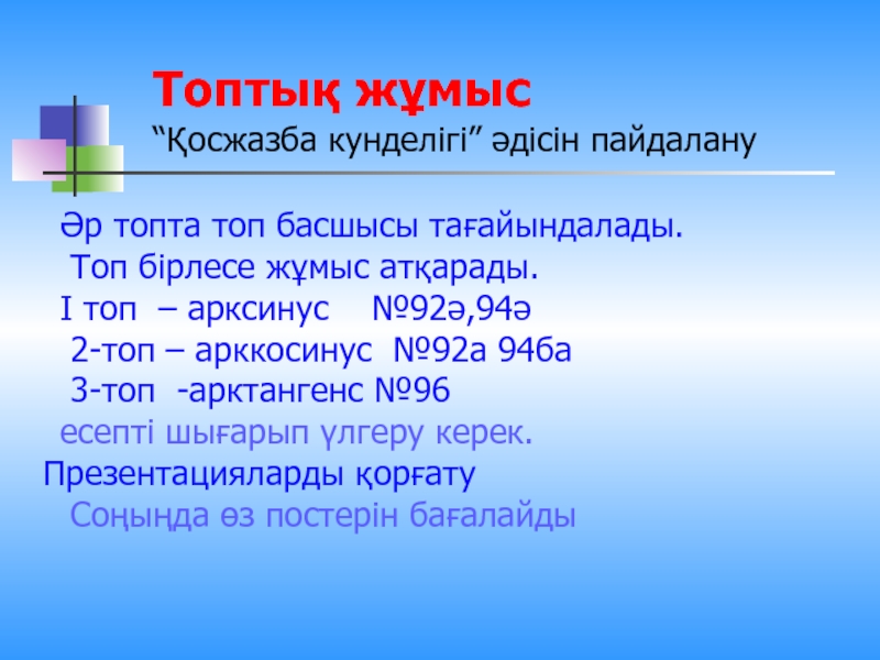 Кері тригонометриялық функциялардың мәндерін есептеуде функцияларды, өрнектерді ықшамдауда, тепе-теңдіктерді дәлелдеуде формулаларды қолдана біледі.