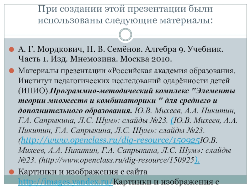 При создании этой презентации были использованы следующие материалы: А. Г. Мордкович, П. В. Семёнов. Алгебра 9. Учебник. Часть 1. Изд. Мнемозина. Москва 2010.Материалы презентации «Российская академия образования. Институт педагогических исследований одарённости детей (ИПИО).Программно-методический комплекс "Элементы теории