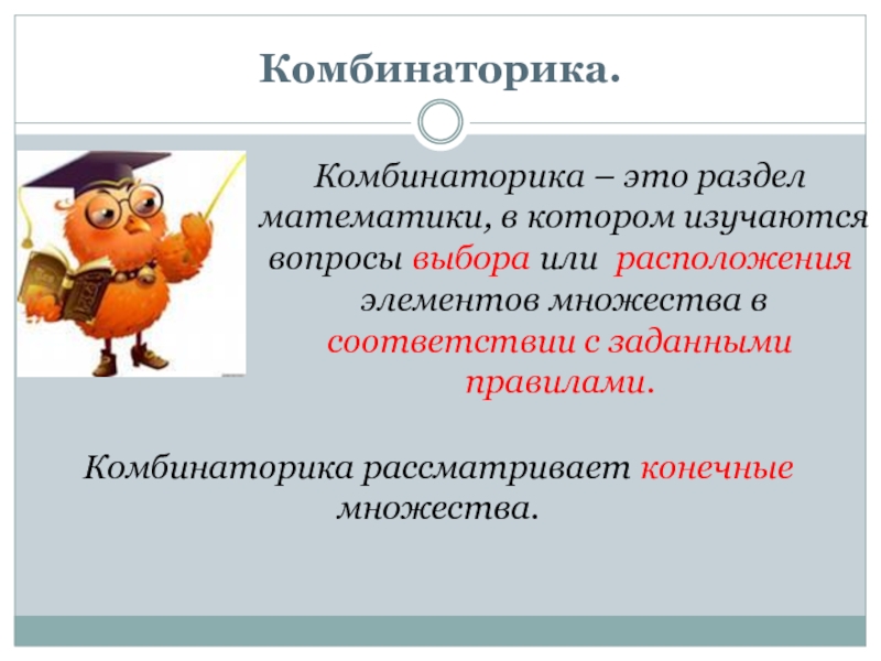 Комбинаторика.Комбинаторика – это раздел математики, в котором изучаются вопросы выбора или расположения элементов множества в соответствии с