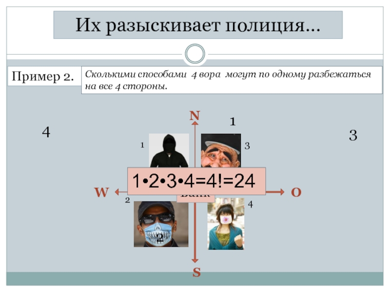 Пример 2.Сколькими способами 4 вора могут по одному разбежаться на все 4 стороны. 2134NOWSБанк43211•2•3•4=4!=24Их разыскивает полиция…