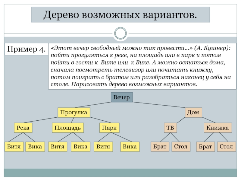 Дерево возможных вариантов.Пример 4.«Этот вечер свободный можно так провести…» (А. Кушнер):пойти прогуляться к реке, на площадь или