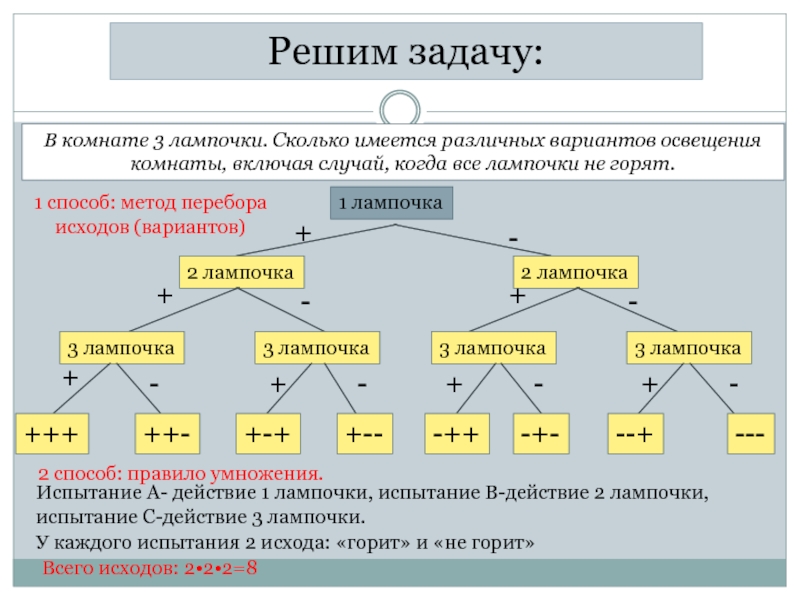 В комнате 3 лампочки. Сколько имеется различных вариантов освещения комнаты, включая случай, когда все лампочки не горят.1