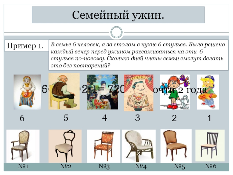 Семейный ужин.Пример 1.В семье 6 человек, а за столом в кухне 6 стульев. Было решено каждый вечер