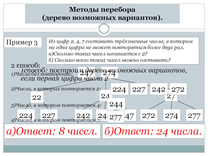 Методы перебора(дерево возможных вариантов). Пример 3Из цифр 2, 4, 7 составить трёхзначные числа, в котором ни одна