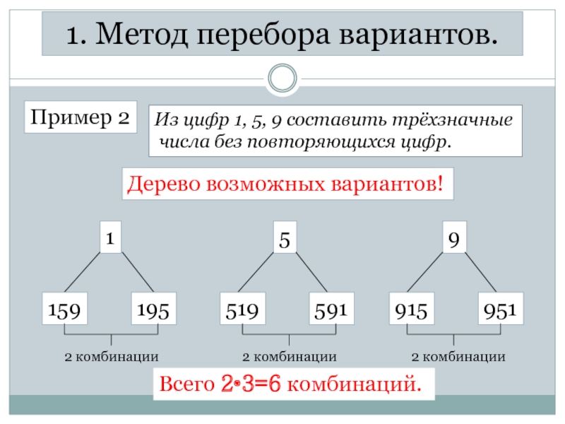 1. Метод перебора вариантов.Пример 2Из цифр 1, 5, 9 составить трёхзначные числа без повторяющихся цифр.Организованный перебор!115919559519591915951 2