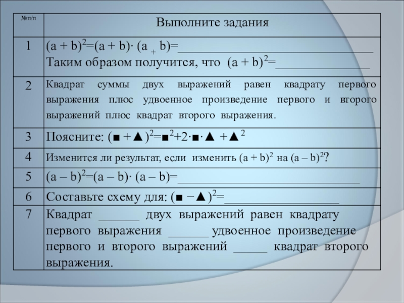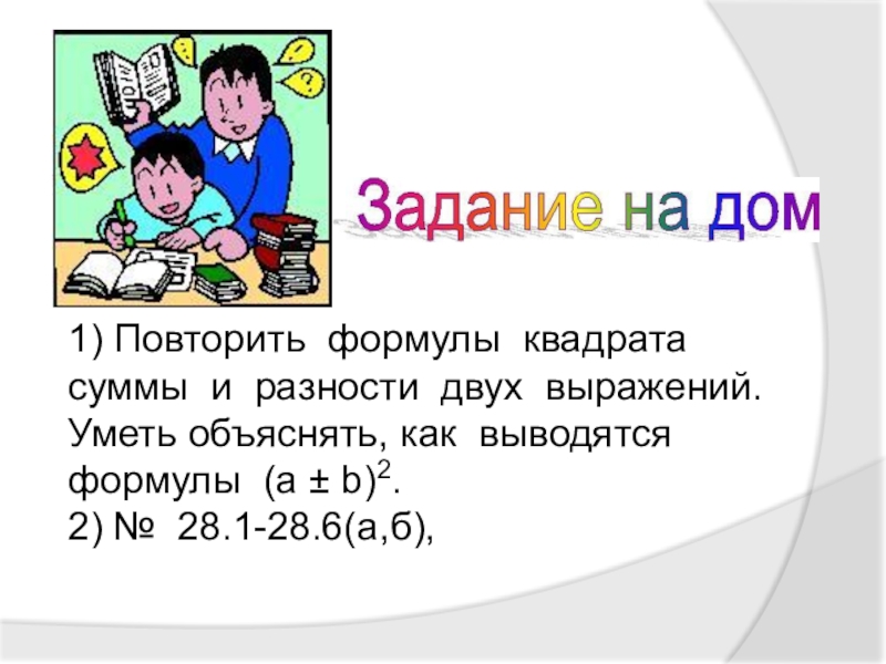 1) Повторить формулы квадрата суммы и разности двух выражений.Уметь объяснять, как выводятся формулы (а ± b)2.2) №