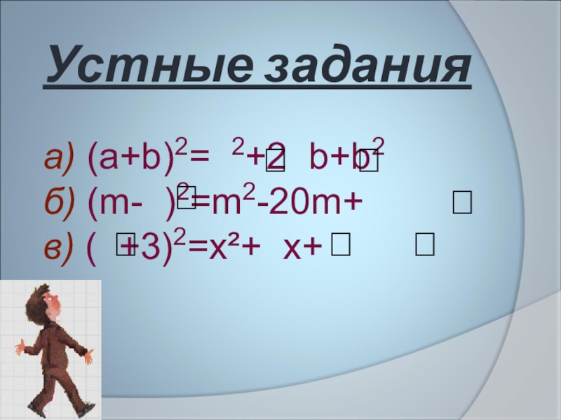 Устные заданияа) (а+b)2= 2+2 b+b2б) (m- )2=m2-20m+в) ( +3)2=х²+ х+