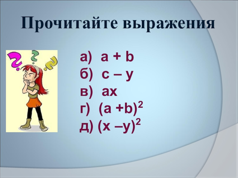 Прочитайте выраженияа) а + bб) c – у в) aхг) (а +b)2    д) (х