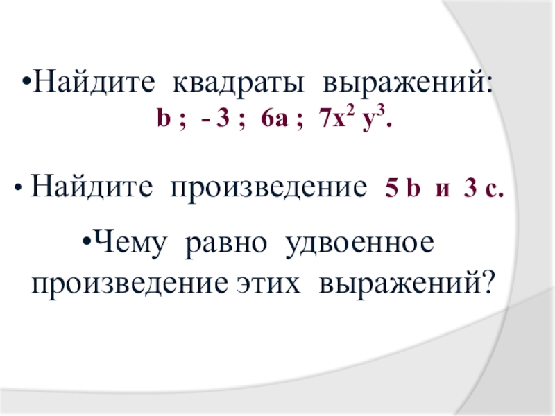 Найдите квадраты выражений:  b ; - 3 ; 6а ; 7х2 у3.   Найдите произведение