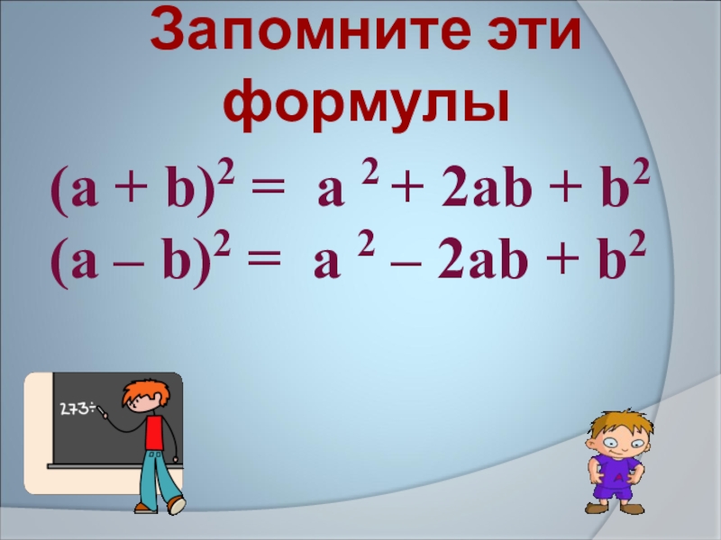 Запомните эти формулы(а + b)2 = а 2 + 2аb + b2 (а – b)2 = а