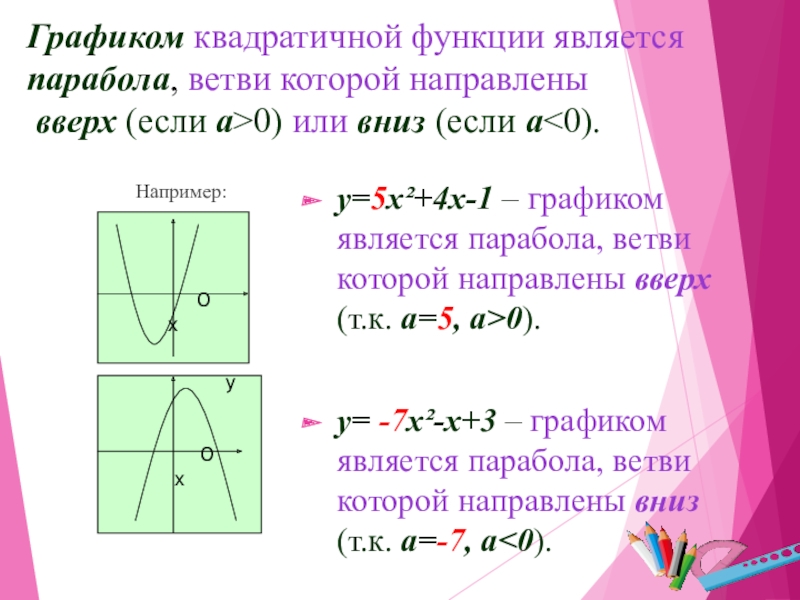у=5х²+4х-1 – графиком является парабола, ветви которой направлены вверх (т.к. а=5, а>0).