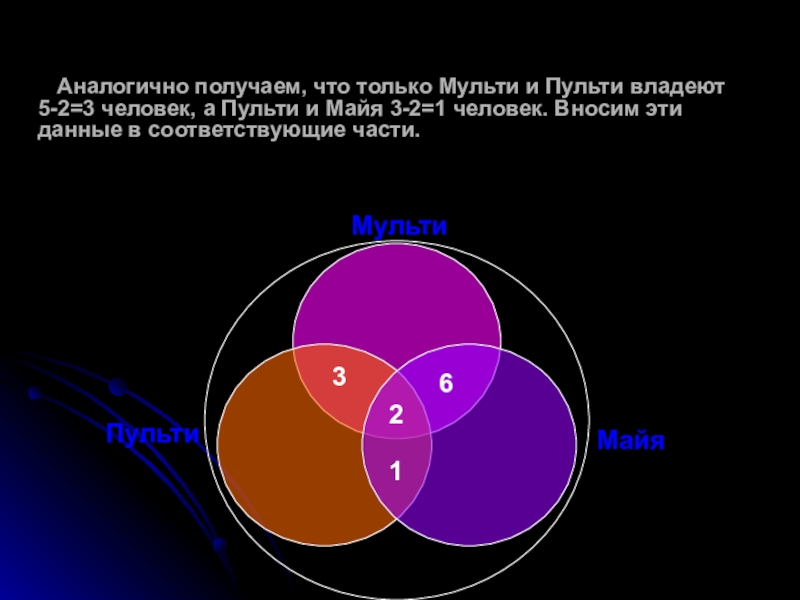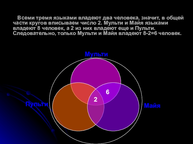 в общей части кругов вписываем число 2. Мульти и Майя языками владеют 8 человек, а 2 из них владеют еще и Пульти. Следовательно, только Мульти и Майя владеют 8-2=6 человек.