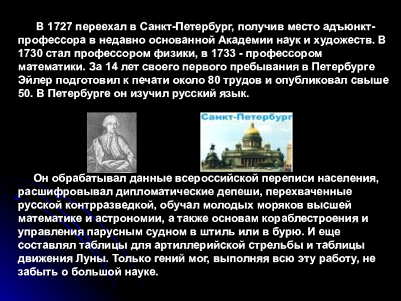 в недавно основанной Академии наук и художеств. В 1730 стал профессором физики, в 1733 - профессором математики. За 14 лет своего первого пребывания в Петербурге Эйлер подготовил к печати около 80 трудов и опубликовал свыше 50. В Петербурге он изучил русский язык.