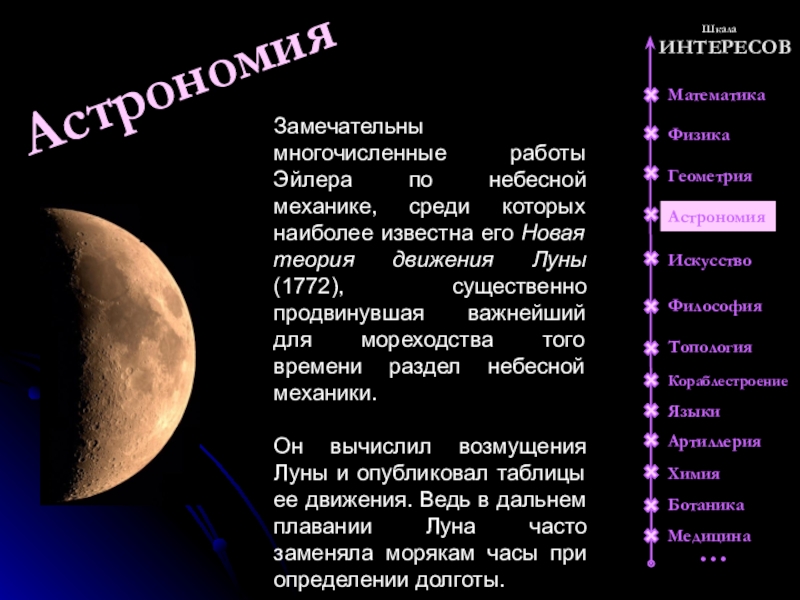 Замечательны многочисленные работы Эйлера по небесной механике, среди которых наиболее известна