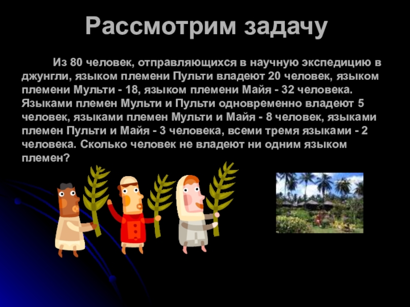 Обозначим кругом тех кто знает язык Мульти, другим кругом - тех, кто знает язык Майя, и третьим кругом - тех, кто знают язык Пульти , четвертый круг – все люди, отправившиеся в джунгли