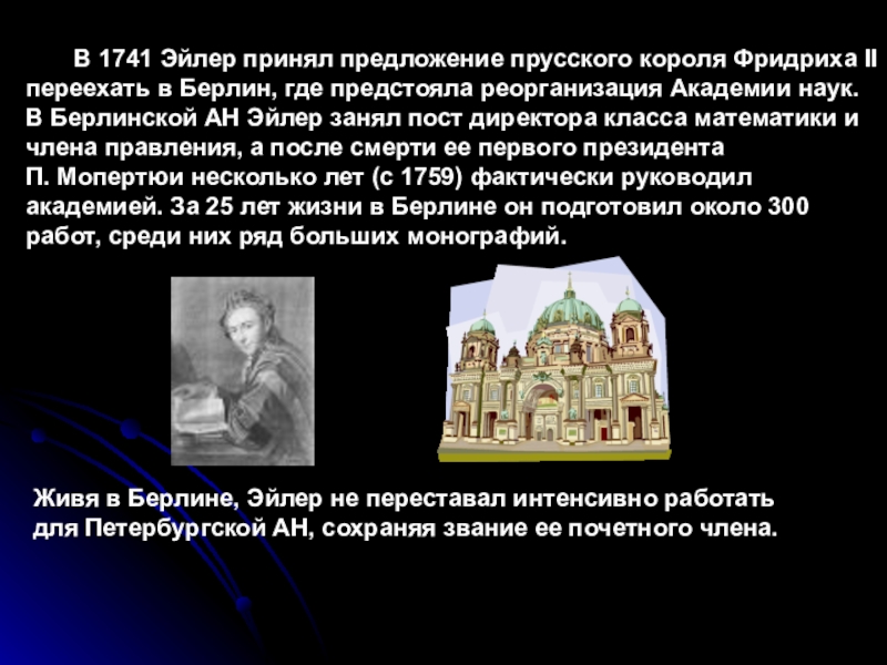 Фридриха II переехать в Берлин, где предстояла реорганизация Академии наук. В Берлинской АН Эйлер занял пост директора класса математики и члена правления, а после смерти ее первого президента П. Мопертюи несколько лет (с 1759) фактически руководил академией. За 25 лет жизни в Берлине он подготовил около 300 работ, среди них ряд больших монографий.