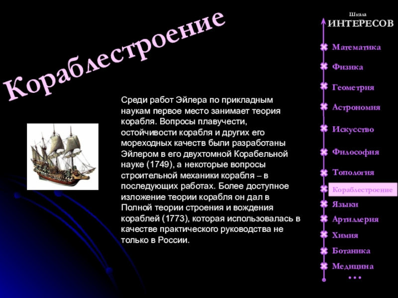 Среди работ Эйлера по прикладным наукам первое место занимает теория корабля.