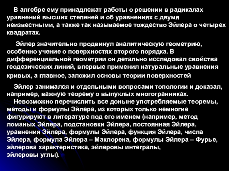 Эйлер занимался и отдельными вопросами топологии и доказал, например, важную теорему о выпуклых многогранниках.