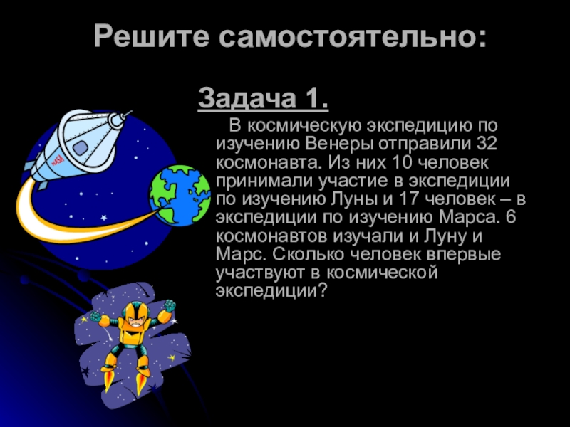 отправили 32 космонавта. Из них 10 человек принимали участие в экспедиции по изучению Луны и 17 человек – в экспедиции по изучению Марса. 6 космонавтов изучали и Луну и Марс. Сколько человек впервые участвуют в космической экспедиции?