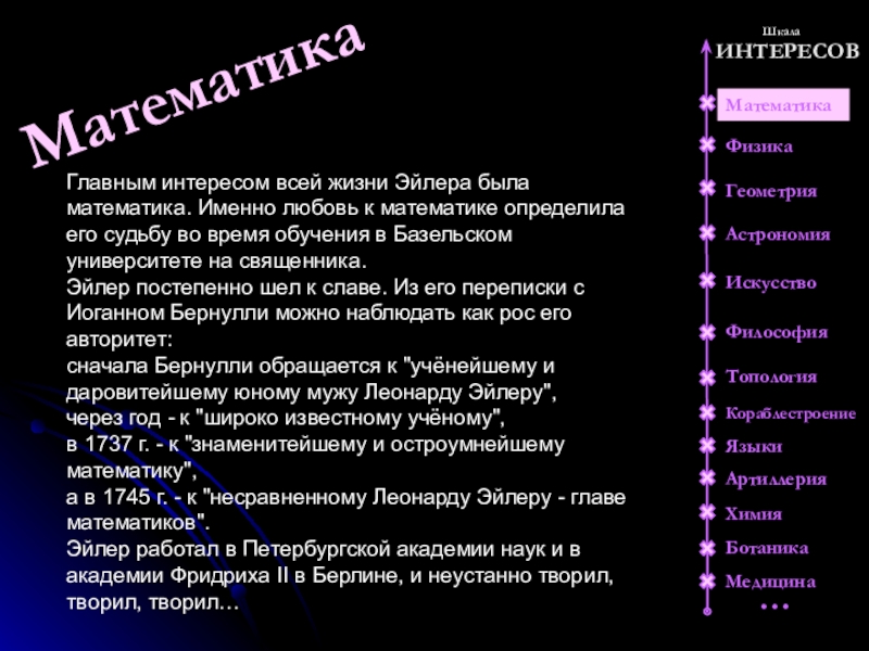 Главным интересом всей жизни Эйлера была математика. Именно любовь к математике