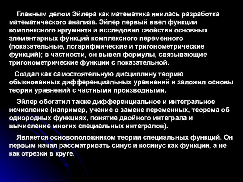 Эйлер первый ввел функции комплексного аргумента и исследовал свойства основных элементарных функций комплексного переменного (показательные, логарифмические и тригонометрические функций); в частности, он вывел формулы, связывающие тригонометрические функции с показательной.