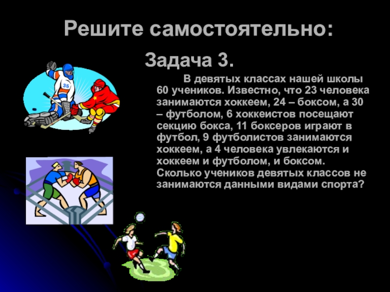 23 человека занимаются хоккеем, 24 – боксом, а 30 – футболом, 6 хоккеистов посещают секцию бокса, 11 боксеров играют в футбол, 9 футболистов занимаются хоккеем, а 4 человека увлекаются и хоккеем и футболом, и боксом. Сколько учеников девятых классов не занимаются данными видами спорта?