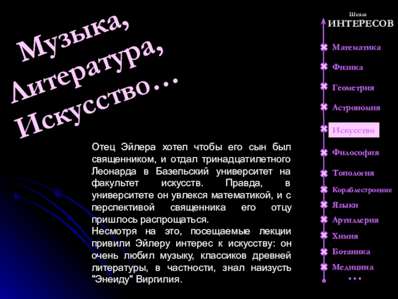 Несмотря на это, посещаемые лекции привили Эйлеру интерес к искусству: он очень любил музыку, классиков древней литературы, в частности, знал наизусть "Энеиду" Виргилия.