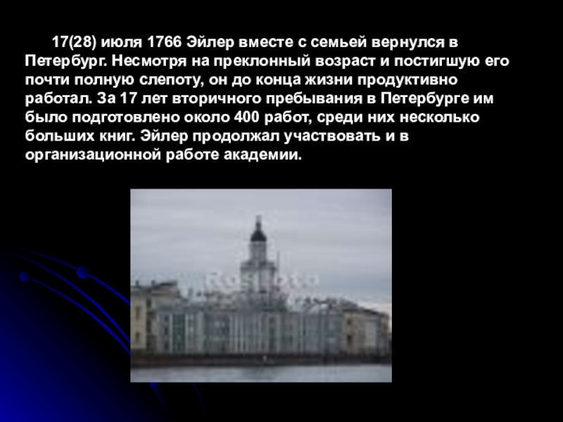 в Петербург. Несмотря на преклонный возраст и постигшую его почти полную слепоту, он до конца жизни продуктивно работал. За 17 лет вторичного пребывания в Петербурге им было подготовлено около 400 работ, среди них несколько больших книг. Эйлер продолжал участвовать и в организационной работе академии.