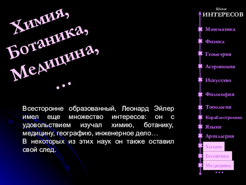 изучал химию, ботанику, медицину, географию, инженерное дело…