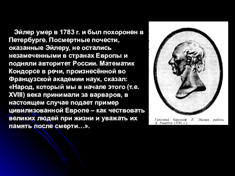 Петербурге. Посмертные почести, оказанные Эйлеру, не остались незамеченными в странах Европы и подняли авторитет России. Математик Кондорсе в речи, произнесённой во Французской академии наук, сказал: «Народ, который мы в начале этого (т.е. XVIII) века принимали за варваров, в настоящем случае подает пример цивилизованной Европе – как чествовать великих людей при жизни и уважать их память после смерти…».