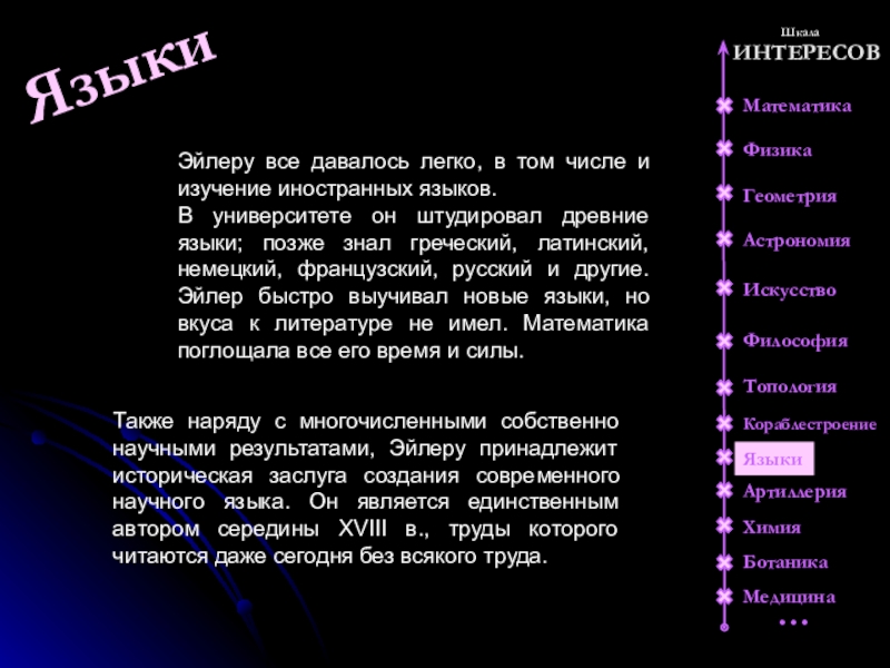 университете он штудировал древние языки; позже знал греческий, латинский, немецкий, французский, русский и другие. Эйлер быстро выучивал новые языки, но вкуса к литературе не имел. Математика поглощала все его время и силы.