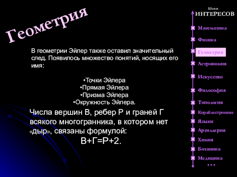 В геометрии Эйлер также оставил значительный след. Появилось множество понятий, носящих его имя:
