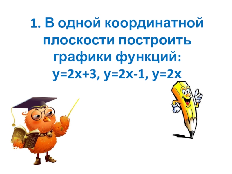 Слайд 31. В одной координатной плоскости построить графики функций: у=2х+3, у=2х-1, у=2х