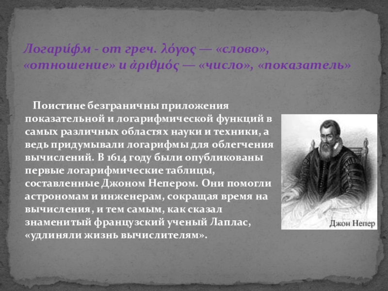 Поистине безграничны приложения показательной и логарифмической функций в самых различных областях науки и техники, а ведь придумывали логарифмы для облегчения вычислений. В 1614 году были опубликованы первые логарифмические таблицы, составленные Джоном Непером. Они помогли астрономам и инженерам, сокращая время на вычисления, и тем самым, как сказал знаменитый французский ученый Лаплас, «удлиняли жизнь вычислителям».