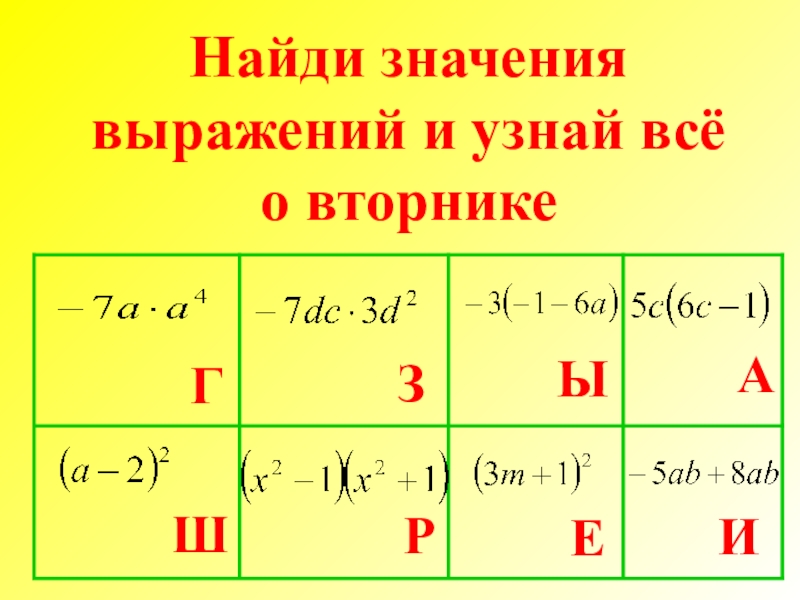 ГЗЫАШРЕИНайди значения выражений и узнай всё  о вторнике