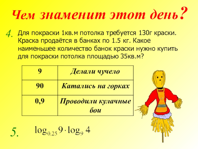 Чем знаменит этот день?4.5.Для покраски 1кв.м потолка требуется 130г краски. Краска продаётся в банках по 1.5 кг.