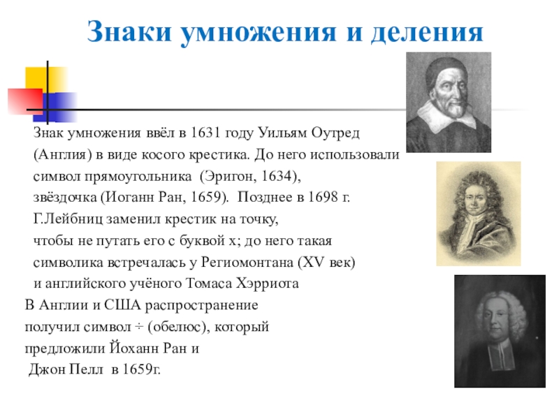 называли и записывали словами. Индийские математики стали первыми обозначать деление начальной буквой названия этого действия – D. Арабы ввели для обозначения деления черту. Ее перенял от арабов в XVIII в. итальянский математик Фибоначчи (Леонардо Пизанский). Знак двоеточия «:» для обозначения деления вошел в употребление в конце XVII в. До этого у некоторых математиков встречался знак «–», которым они обозначали это действие.