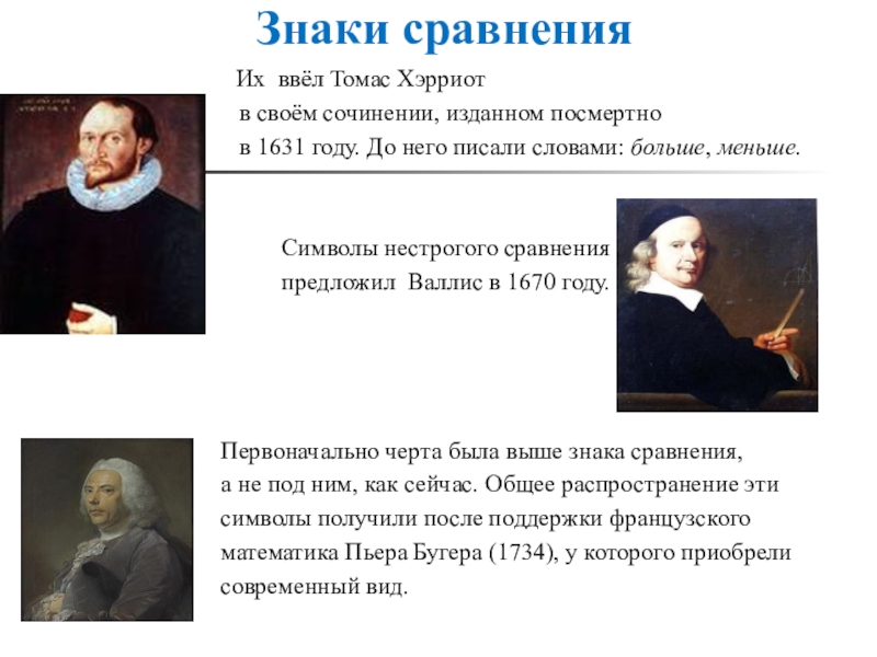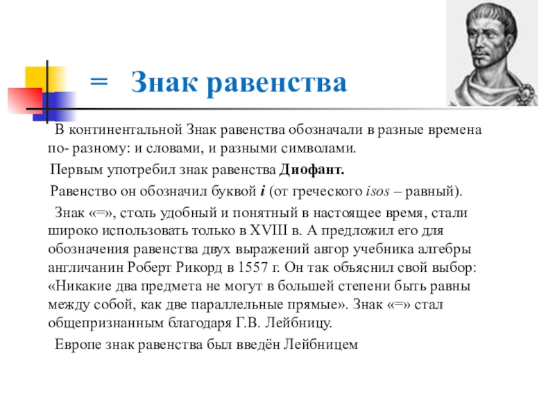 Знак «=», столь удобный и понятный в настоящее время, стали широко использовать только в XVIII в. А предложил его для обозначения равенства двух выражений автор учебника алгебры англичанин Роберт Рикорд в 1557 г. Он так объяснил свой выбор: «Никакие два предмета не могут в большей степени быть равны между собой, как две параллельные прямые». Знак «=» стал общепризнанным благодаря Г.В. Лейбницу.