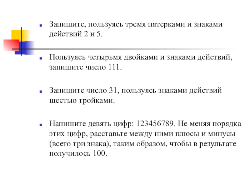 Слайд 26Запишите, пользуясь тремя пятерками и знаками действий 2 и 5.