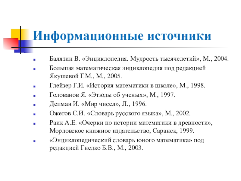 Глейзер Г.И. «История математики в школе», М., 1998.