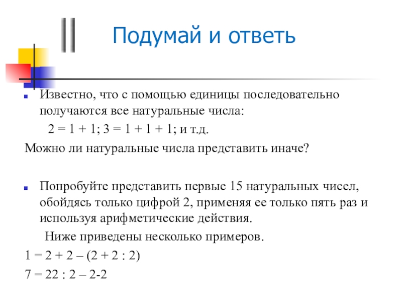 2 = 1 + 1; 3 = 1 + 1 + 1; и т.д.