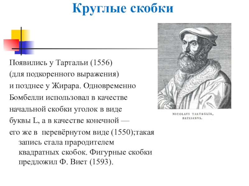 его же в перевёрнутом виде (1550);такая запись стала прародителем квадратных скобок. Фигурные скобки предложил Ф. Виет (1593).