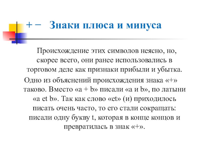 Одно из объяснений происхождения знака «+» таково. Вместо «а + b» писали «а и b», по латыни «а et b». Так как слово «et» (и) приходилось писать очень часто, то его стали сокращать: писали одну букву t, которая в конце концов и превратилась в знак «+».