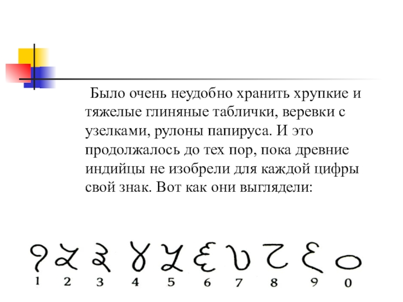 узелками, рулоны папируса. И это продолжалось до тех пор, пока древние индийцы не изобрели для каждой цифры свой знак. Вот как они выглядели: