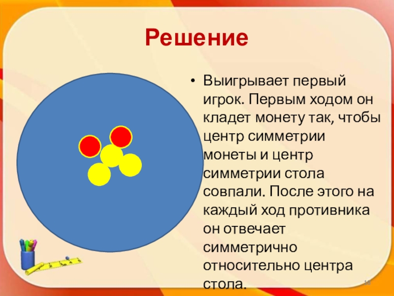 симметрии монеты и центр симметрии стола совпали. После этого на каждый ход противника он отвечает симметрично относительно центра стола.