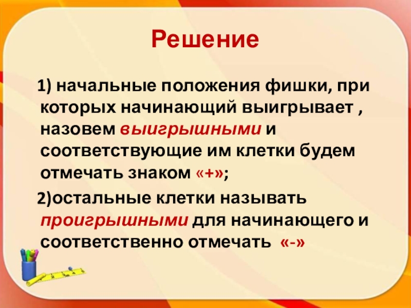 2)остальные клетки называть проигрышными для начинающего и соответственно отмечать «-»