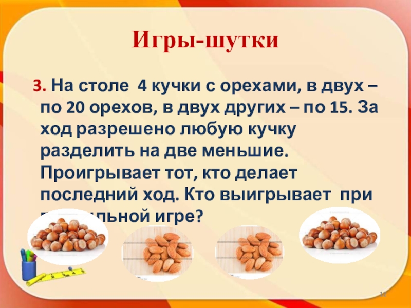 3. На столе 4 кучки с орехами, в двух –