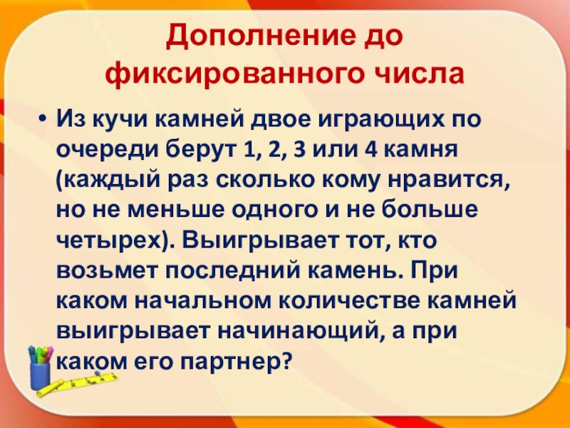 пуговицы, орехи, спички – все равно): в первой – 7, во второй – 5. Играют двое, ходят по очереди. Каждый из игроков при своем ходе может взять любое число камней из первой кучки, или из второй. Или из обеих сразу, но тогда обязательно поровну. Выигрывает тот, кто взял последний камень. Кто победит в этой игре: начинающий или противник? Какой будет ответ, если вначале в первой кучке было 7 камней, а во