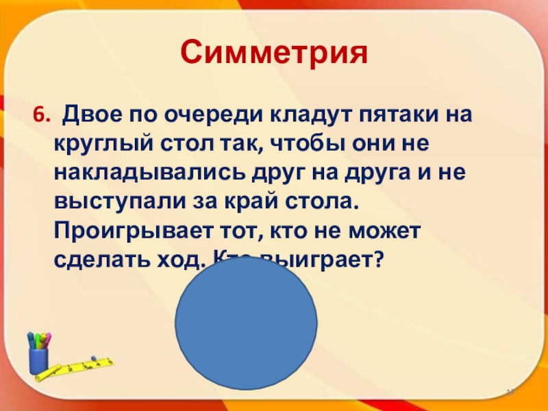 6. Двое по очереди кладут пятаки на круглый стол так, чтобы